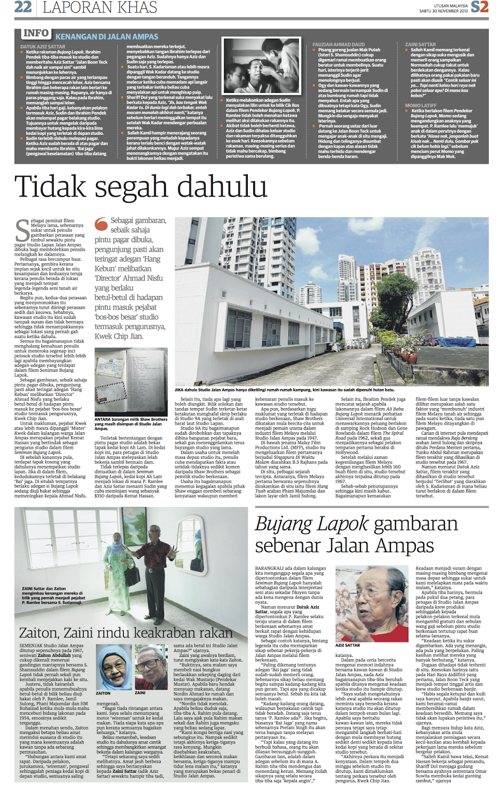 Untuk mengimbau kembali sekelumit dari jutaan cerita yang tersimpan di Studio Jalan Ampas dan rumah teres Jalan Boon Teck yang pernah menjadi tempat tinggal artis serta petugas di studio berkenaan, wartawan S2, MOHD. RAFIE AZIMI bersama jurugambar, ABDUL RAZAK LATIF, AZMAN ASMAYATIM, HAFIZ JOHARI dan MOHD. FARIZWAN HASBULLAH baru-baru ini berkunjung ke Jalan Ampas selain menemui mereka yang pernah menjalani kehidupan di lokasi bersejarah itu.